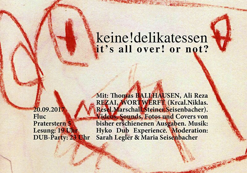 Die Literaturzeitschrift Keine Delikatessenlädt zur Abschiedsparty. Mit StammautorInnen und WegbegleiterInnen wie Thomas Ballhausen, die Wortwerft (Krcal.Niklas.Resel.Marschall.Steiner.Seisenbacher), Ali Reza Rezai. Videos, Sounds, Cover (u.a. Karin Ziegelwanger) & Fotos (u.a. Sabine Ziegelwanger) der bisher erschienenen Ausgaben. Musik:Hyko Dub Experience mit Live-Performance & MCs