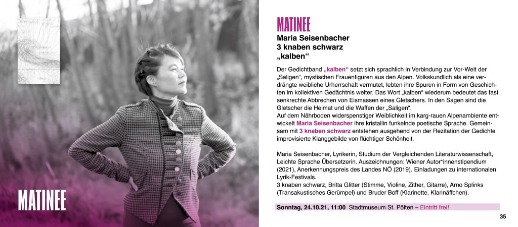 Auf dem Nährboden widerspenstiger Weiblichkeit im karg-rauen Alpenambiente entwickelt Maria Seisenbacher ihre kristallin funkelnde poetische Sprache. In Verbindung mit der Formation „3 knaben schwarz“ entstehen ausgehend von der Rezitation der Gedichte improvisierte Klanggebilde von flüchtiger Schönheit.
