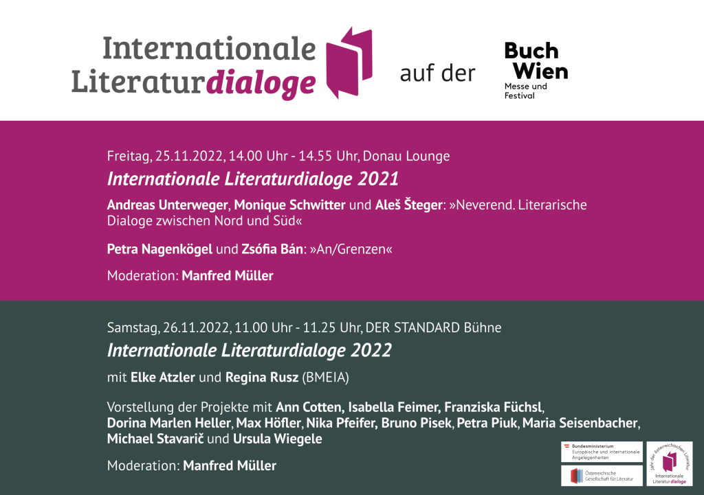 Am Samstag, dem 26.11, fand die öffentliche Verkündung aller Gewinner*innen der ›Internationalen Literaturdialoge 2022‹ statt. Elke Atzler und Regina Rusz (BMEIA) sprachen mit Manfred Müller über die Initiative; anschließend erfolgte die Vorstellung aller Projekte unter Beteiligung einiger der Sieger*innen. Wir freuen uns, dass Ann Cotten, Petra Piuk, Maria Seisenbacher und Ursula Wiegele bei der Präsentation dabei waren!